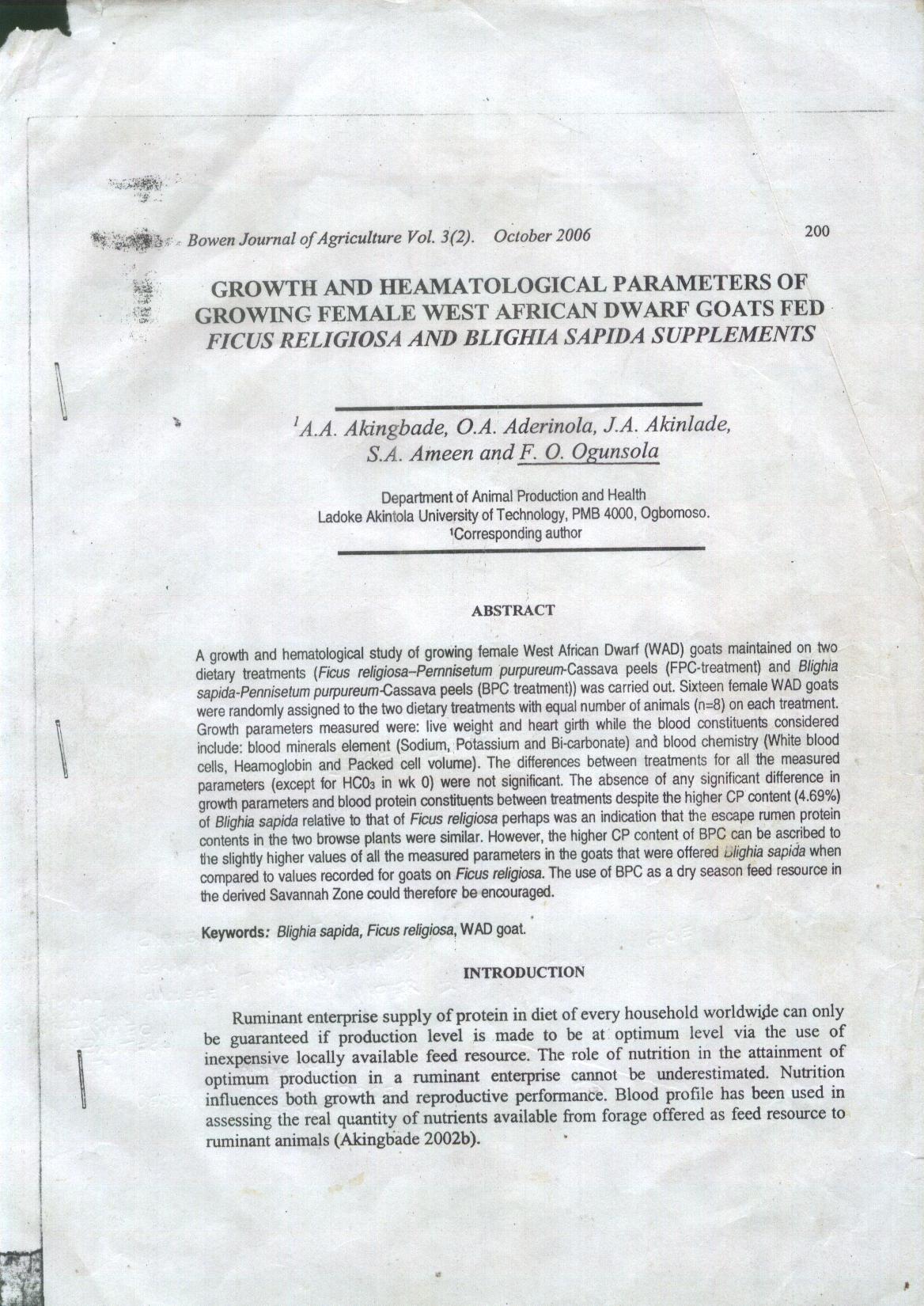 Growth and heamtological parameters of growing female West African dwarf goats fed <i>Ficus religiosa</i> and <i>Blighia sapida </i> supplements | Bowen Journal of Agriculture Main Navigation Main Content Sidebar Register Login HOME JOURNALS By Category Alphabetically By Country By JPPS Rating List All Titles Free To Read HOW TO USE AJOL For Researchers For Librarians For Authors FAQ's RESOURCES For Journals For Researchers For Authors For Policy Makers SUPPORTERS Bowen Journal of Agriculture Journal / Bowen Journal of Agriculture / Vol. 3 No. 2 (2006) / Articles Current Archives About About the Journal Author Guidelines Editorial Team Contact Article Sidebar download Requires Subscription PDF DOI: 10.4314/bja.v3i2.41921 Article Details Issue Vol. 3 No. 2 (2006) Section Articles Copyright is held by the faculty of Agriculture, Bowen University. Main Article Content Growth and …