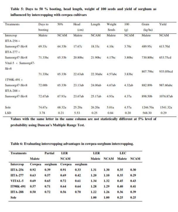 The need to increase cowpea production to solve the menace of malnutrition is a global challenge and land limitations have also made intercropping indispensable. Field trials were carried out at the Teaching and Research Farm, Kwara State University, Malete, and National Centre for Agricultural Mechanization (NCAM) Idofian to evaluate the growth and yield of cowpea cultivars and sorghum with their competitive behavior in cowpea-sorghum intercropping. Five cultivars of cowpea (IITA-256, IITA-277, VITAL-5, IT98K-491-4, and IITA-288) were intercropped with sorghum. Sole crops were included in the treatments as a check. The treatments were arranged in a Randomized Complete Block Design and replicated three times. Among the sole, vital-5 cultivar had the highest number of branches and pods per plant and more seeds per pod compared to other cultivars. The cultivar also recorded the highest grain yield 591.30 kg/ha and 530.00 kg/ha respectively, for Malete and NCAM at the sole. At the intercrop, IITA-288 significantly had the least number of branches per plant and took longer days to attain flowering compared to other cultivars. The lowest grain yield at the intercrop was also obtained with this cultivar. Sorghum intercropped with cowpea cultivar IITA-288 was at par with the sole sorghum in all the parameters. The least grain yield of sorghum at the intercrop was obtained in sorghum intercropping with IITA-256 cowpea cultivar. The maximum Land Equivalent Ratio (LER), and Land Equivalent Coefficient (LEC), was obtained with the Vital-5 cultivar. Regardless of location, the competitive ratio (CR) values for IITA-256, IITA-277, and Vital-5 cowpea cultivars were higher than sorghum. The aggressivisity, (A) for these cultivars were also positive for cowpea and negative for sorghum. Although, all the cowpea cultivars demonstrated intercropping advantages in efficient utilization of natural resources intercropping with the Vital-5 cowpea cultivar was superior and could be adopted by the farmer